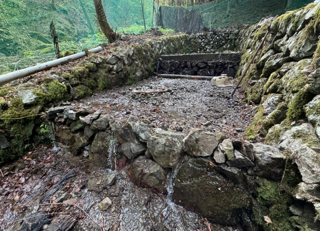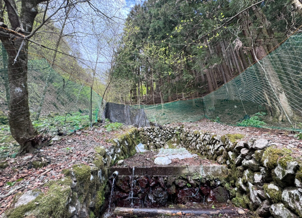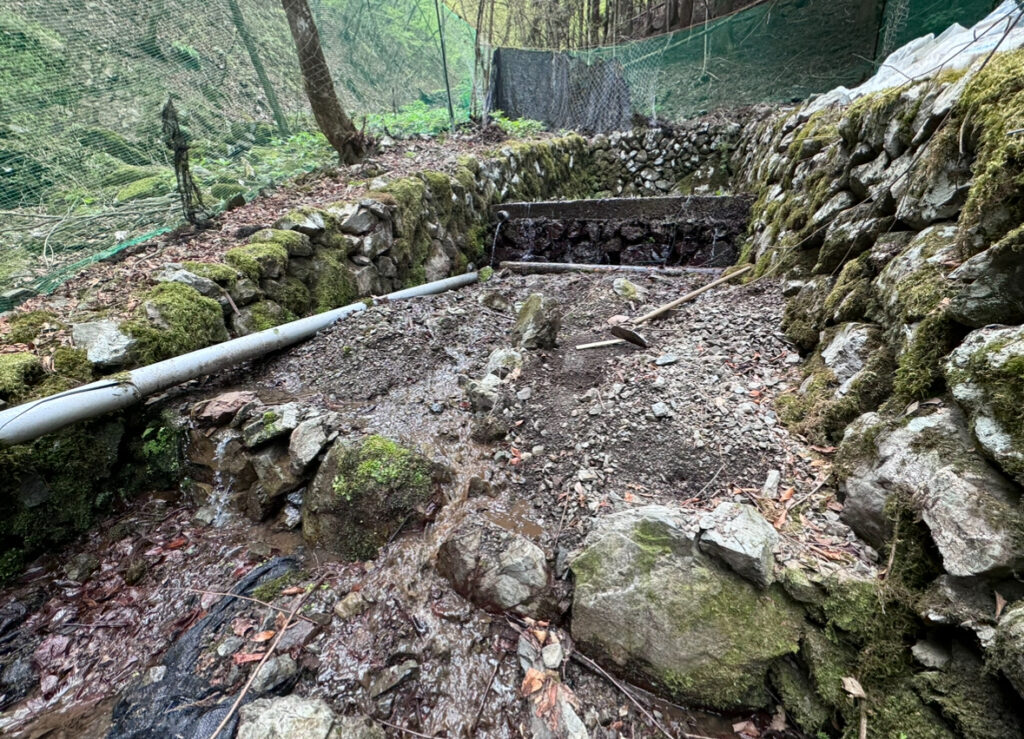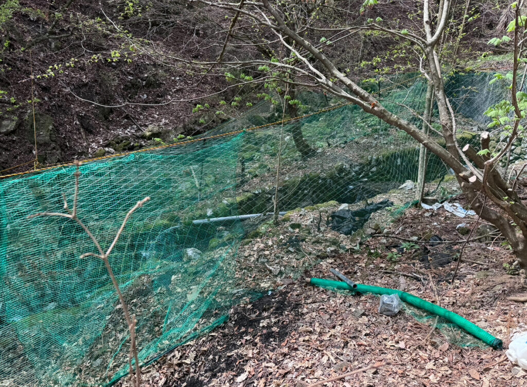 獣害対策としてのネット設置:獣の侵入を防ぐため、ホームセンターで購入したネットをわさび田の周囲に張り巡らせました。特に地面との隙間を無くし、侵入が困難な状態にしています。ただし、耐久性を考慮して、将来的にはワイヤ入りのネットに張り替える予定です。