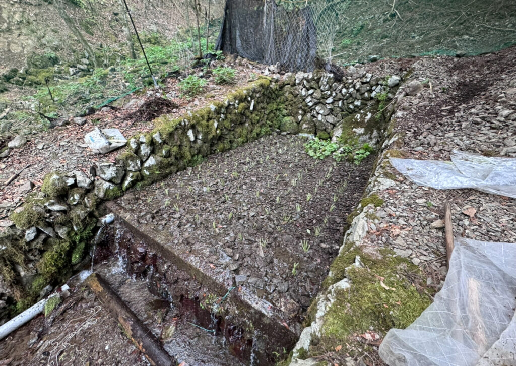苗の植え付け:2段目の畑を含め、わさび300本の苗を植え付けました。また、成長が期待できる沢筋の小さなエリアにも試験的に50本ほど植え付けました。さまざまな植え付けを行うことで、今後の成長や環境に対する反応を観察する予定です。